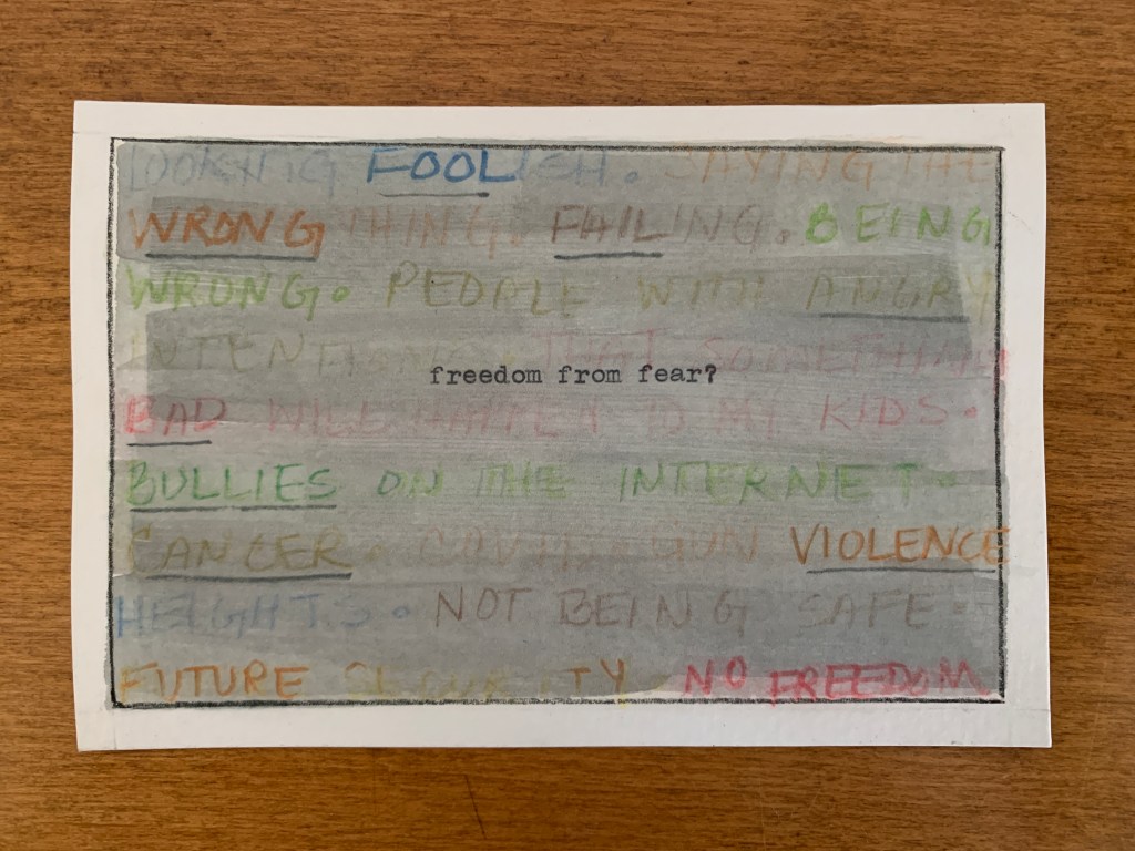 Reflecting: What activity, image, or object represents freedom of speech to you? freedom of worship? freedom from want? freedom from fear? Do you think of these freedoms are rights? promises? hopes? dreams?